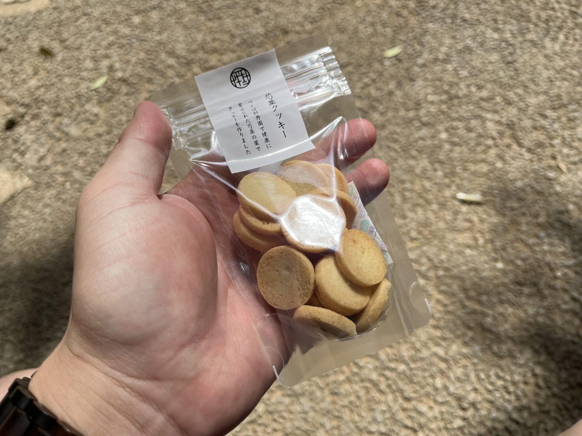 芍薬の茎や葉が混ざっているそうです。葉っぱ感はなく、甘くて美味しいクッキーでした。